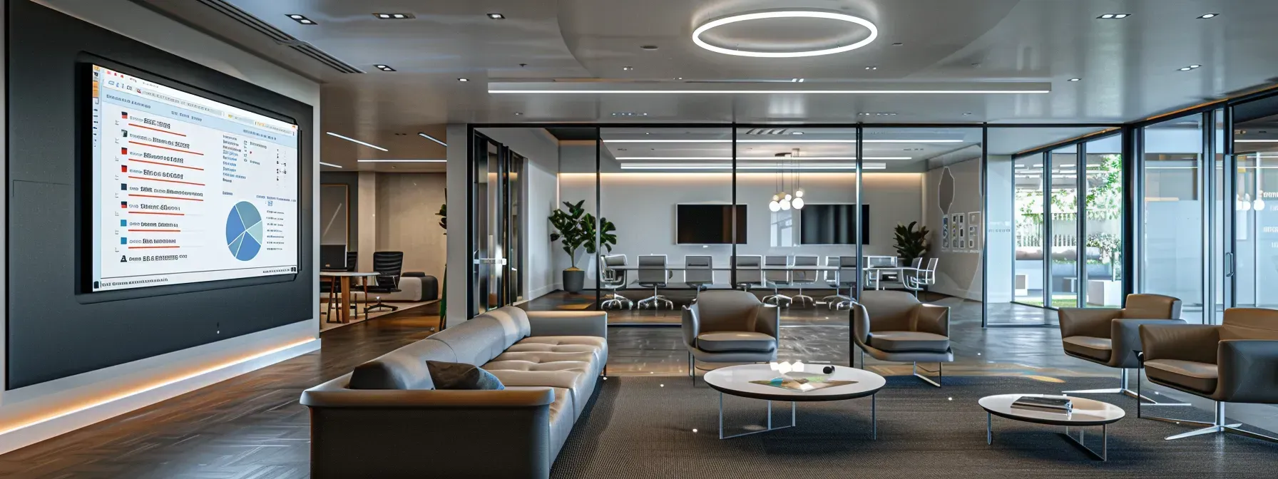 a dynamic real estate office with sleek modern furnishings and a large digital screen showcasing ppc advertising analytics, illuminated by warm artificial lighting to convey a professional yet inviting atmosphere of digital marketing expertise.